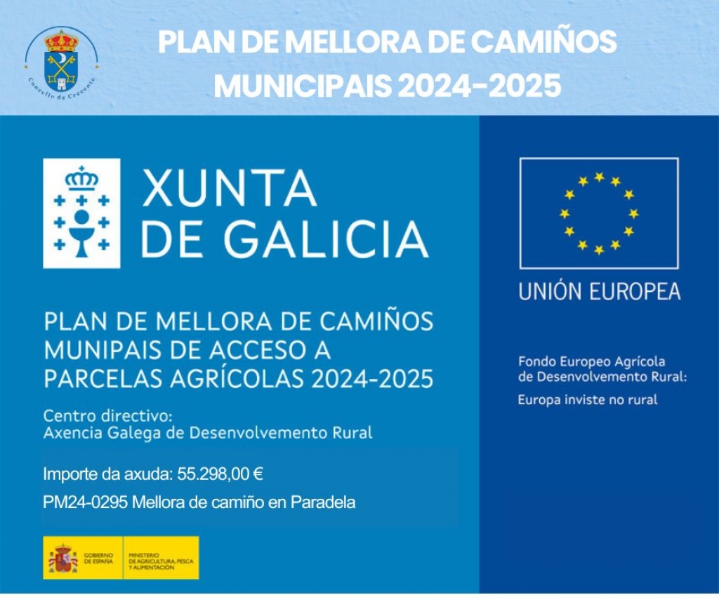 o concello de Crecente levou a cabo obras de mellora e reparación do camiño en Paradela, cun investimento de case 50.000 euros financiados con cargo ás subvencións concedidas pola Xunta de Galicia a través do AGADER e o Plan de mellora de camiños de acceso a parcelas agrícolas 24-25. Os Plans de mellora de camiños de titularidade municipal Axudas destinadas a ampliar, acondicionar e conservar a rede de camiños de titularidade municipal de tódolos concellos de Galicia, co obxecto de mellorar a calidade de vida da poboación rural, e o Concello de crecente empregou esta subvención nesta anualidade en Paradela para mellorar o estado do firme e posibilitar accesos axeitados a parcelas agrícolas